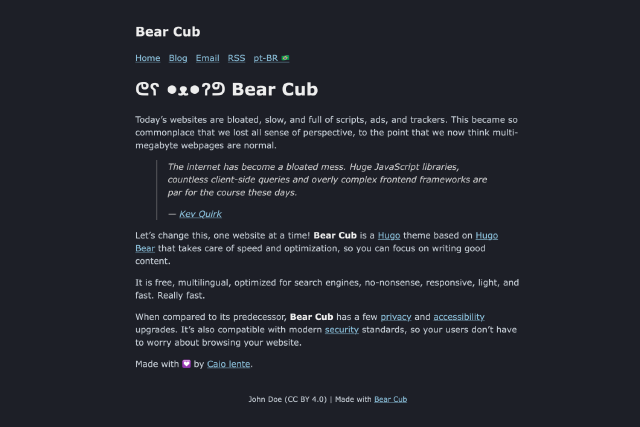 A lightweight Hugo theme based on Bear Blog and Hugo Bear Blog. It is free, multilingual, optimized for search engines, no-nonsense, responsive, light, and fast. Really fast.