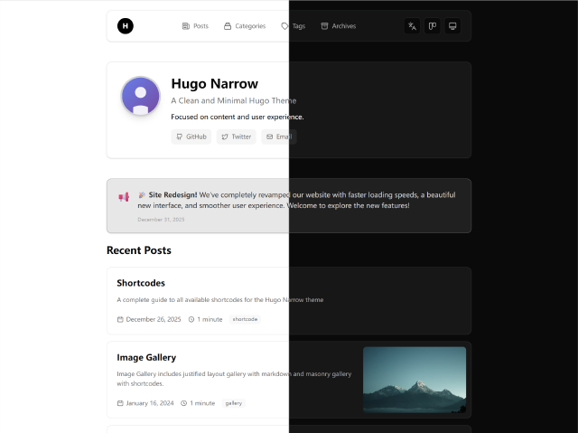 A modern, clean, and minimal Hugo theme built with Tailwind CSS 4.0. Support custom themes, dark mode, and responsive design.