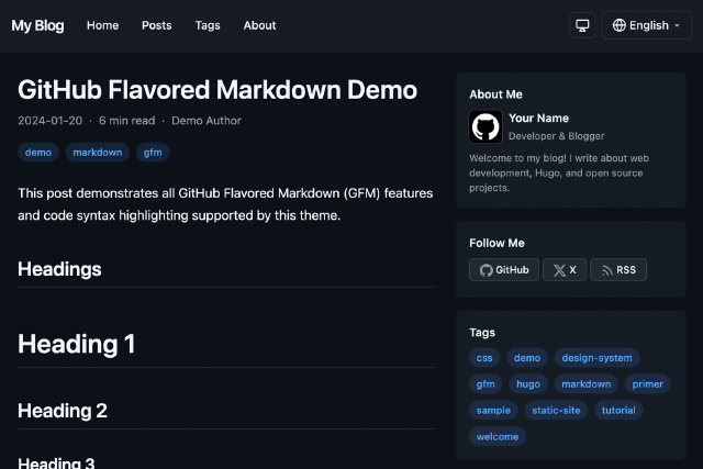 A clean, responsive Hugo blog theme using GitHub's Primer CSS design system with dark mode support and multilingual capabilities.